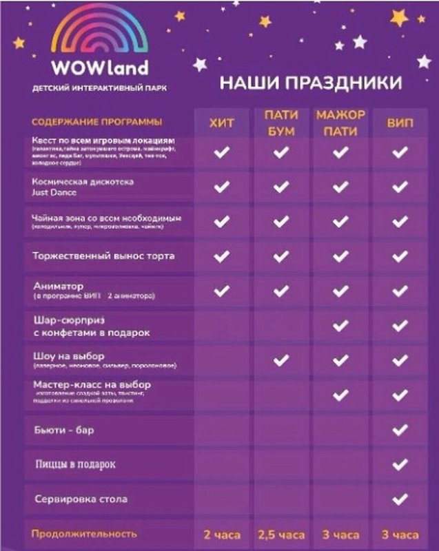 Советуем заранее позаботиться по поводу времени посещения компании по организации детских праздников Wow Land в Балашихе для того, чтобы множество орг. моментов не омрачили ваш отдых. Наши сотрудники оперативно проинформируют вас по любому запросу.